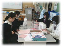 そこで、佐藤先輩ともお話し、「ともに生理用品を必要としている人に届けよう」と、家庭クラブ活動として取り組むことにしました。放課後に家庭生活部や家庭クラブ役員で、製作しました。完成したナプキンの吸水実験を実施しながら試行錯誤し、布ナプキンをウガンダへ届けることが出来ました。